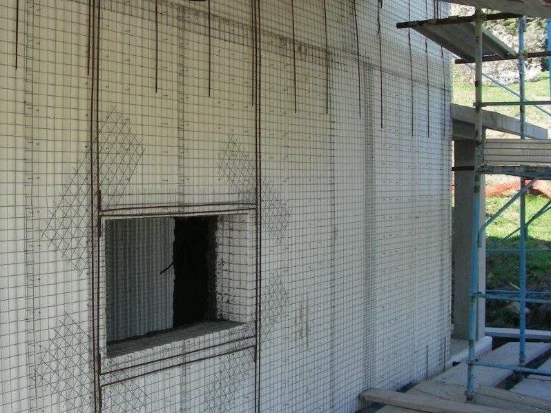 - **Revestimiento**: Los paneles de EPS se recubren con una capa de cemento proyectado, que se adhiere a la malla y proporciona rigidez y protección contra incendios